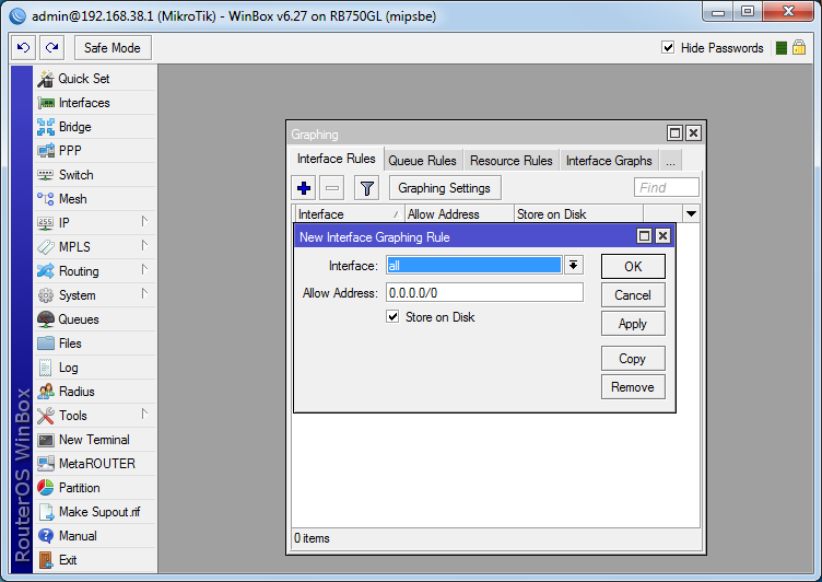 4.Klik Graphing setting > Store Every "disini saya pilih 5 min" > Apply > Ok.